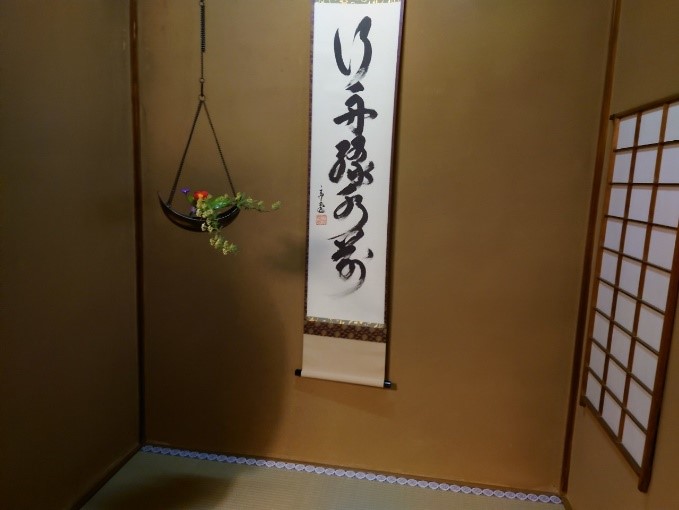 待合の軸は「太田垣連月」筆「ところせく かをるこの目に ほととぎす しのびかねたる ゆふぐれの声」本席の軸は鵬雲斎大宗匠筆「行舟緑水前」