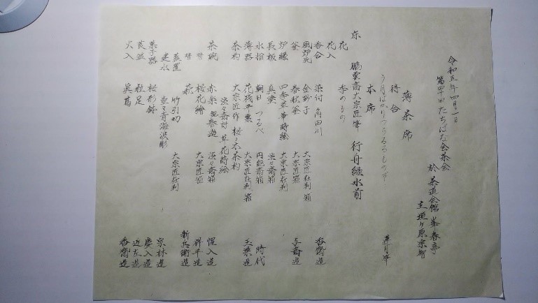 今回は他の席と趣向や点前が被らないように席主間で打合せをした結果、広間担当の当方は「長板一つ置」。当初、長板一つ置は濃茶が相応しいかな…と思っていたら、茶会の3日前に裏千家宗家の利休忌に参加し、よく見るとなんと薄茶席が長板一つ置だったではありませんか!